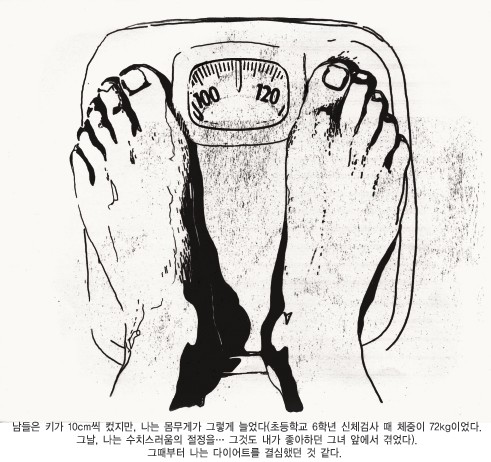매년 찾아오는 가뭄, 홍수 같은 자연재해면 차라리 낫겠다. 그렇다면 어쩔 수 없는 자연의 섭리겠거니 하고 받아들일 텐데, 이건 분명 인재다. 해결할 수 있는 문제인데 나의 나태함과 무사안일주의로 빚어낸 결과다. 28년을 살들과 함께 살아오면서 내린 결론이다. 어릴 적 3.2kg의 아주 건강한 아이로 태어난 나는 부모님은 물론 할머니의 무궁무진한 사랑을 받았다. 그도 그럴 것이 부모님이 결혼한 지 5년 만에 얻은 ‘독자’였던 탓이다. 결국 나는 소싯적부터 ‘녹용과 인삼’을 쉽게 접했고 그 결과 초등학교 내내 신체검사 날이 인생에서 가장 불행한 날이 됐다. 그렇게 건강한 채로 학창 시절을 보냈고 스물여덟 살이 된 지금, 인생 최대의 고비를 맞았다. 대학 시절 운동과 식이요법으로 간신히 되돌려놓은 두 자릿수 몸무게가 붕괴된 거다(남들은 쉽게 이해가 되지 않겠지만 나는 대학교 입학 당시 킬로그램급이 아니었다. 톤급으로 놀았다). 곰곰이 생각해보면 기자가 된 지난 2년 동안 나의 생활은 불규칙함의 연속이었다. 다달이 찾아오는 마감과 스트레스, 그리고 잦은 야식과 마감 후 친구들, 직장 선후배들과의 릴레이 술자리. 행사장에서 가득 차려내는 산해진미들. 먹고 또 먹고, 눕고 또 누웠다. 그렇게 두 해가 흘렀다.