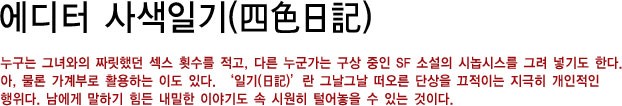 누구는 그녀와의 짜릿했던 섹스 횟수를 적고, 다른 누군가는 구상 중인 SF 소설의 시놉시스를 그려 넣기도 한다. 아, 물론 가계부로 활용하는 이도 있다. `일기(日記)`란 그날그날 떠오른 단상을 끄적이는 지극히 개인적인 행위다. 남에게 말하기 힘든 내밀한 이야기도 속 시원히 털어놓을 수 있는 것이다. 이런저런 이유로 심사가 복잡한 요즈음, 문득 일기를 써보고 싶어졌다. 아니, 한 달에 한 번씩일 테니 `월기(月記)`라 해야 할까?<br><br>[2008년 6월호]