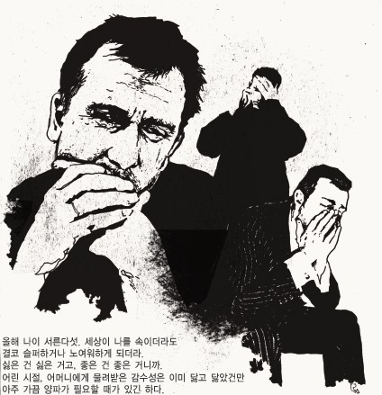 솔직히 아직까지도 아버지와 나누는 대화는 그리 많지 않다. 하지만 서른 중반의 나이에 이르고 보니 아버지가 왜 그렇게 눈물을 참고 살아야 했는지, 왜 당신의 자식에게 눈물을 금기시했는지 조금은 알 것 같다. 막 군에 입대했을 때, 2년간 사귀었던 그녀가 편지로 결별을 통보했다. 이등병 나부랭이에 불과했던 나는 고참들 앞에서 눈물을 보일 위치가 아니었다. 하루 일과를 마친 뒤 샤워가 허락되는 딱 5분 동안 나는 격렬하게 눈물을 흘렸다. 샤워기에서 물이 끊기자마자 무슨 일이 있었냐는 듯 멀쩡한 얼굴로 걸어 나왔음은 물론이다.