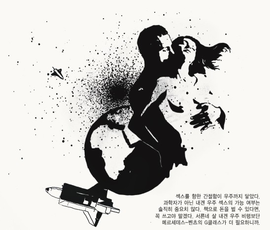 대한민국이 우주로 나갔다며 호들갑이었다. 남의 배를 타고 지구 밖을 유영한 게 그렇게도 자랑스러웠을까. 조만간 돈만 주면 사설 우주여행을 즐길 수 있을 텐데, 어째서 그 많은 세금을 써야 했던 걸까. 난 비판적이었다. 한국 최초 우주인 탄생은 내 인생에 어떤 영향도 미치지 않을 거라 생각했다. 근데 그렇지 않았다. 최초의 대한민국 우주인을 보며 야심찬 계획이 떠올랐으니까. 무중력 상태에서의 섹스를 위한 <우주 카마수트라>라는 체위 교양서를 출간하면, 우주 세기를 대표하는 작가로 역사에 남을 수 있을 거란 전망이 날 사로잡았다. 막연하게 우주에서의 섹스를 떠올렸을 땐, 마냥 즐겁겠지만 말처럼 그리 쉬운 일이 아니다. 과학 작가 배너 본타는 남편과 무중력 공간 체험 후 섹스는커녕 키스조차도 쉽지 않았다는 말을 남겼다. 무중력 섹스를 미리 체험하고 가능한 체위들을 정리해 묘사한다면, 절판은 따놓은 당상일 거다.