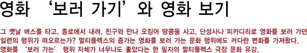 그 옛날 버스를 타고, 종로에서 내려, 친구와 만나 오징어 땅콩을 사고, 단성사나 피카디리로 영화를 보러 가던 일련의 행위가 떠오르는가? 멀티플렉스의 증가는 영화를 보러 가는 문화 행위에도 커다란 변화를 가져왔다. 영화를 `보러 가는` 행위 자체가 너무나도 좋았다는 한 필자의 멀티플렉스 극장 문화 유감. <br><Br>[2008년 6월호]