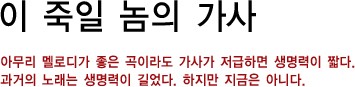 그러면 누군가는 물을 것이다. ‘나만 좋으면 됐지, 뭘 더 바라냐’고. 맞다. 자신만 좋으면 된다. 하지만 이런 저급한 노래들이 음반 차트의 상위권을 차지하고, 어디에서도 귀에 들려올 정도면 그때는 거의 공해 수준이 된다. 지난해, 모바일 차트 1위를 차지하며 큰 인기를 누렸던 하하의 ‘키작은 꼬마 이야기’는 광장시장에서도, 압구정 스타벅스에서도 들을 수 있었다. 하지만 아무리 인기 버라이어티 프로그램의 후광을 입었다 해도, 아무리 친숙한 멜로디를 가지고 있었다 해도, 선무당이 염불이라도 외우는 것 같은 이상한 발음 뒤에 ‘죽지 않는다’는 밑도 끝도 없는 가사가 난무하는 이 장난 같은 노래가 대한민국에서 많은 사람들이 즐겨 듣는 노래라는 사실은 참 슬프다. 불과 수십 년 전만 해도 이 땅의 노래에는 어떤 품위가 있었다는 사실을 기억한다면 더더욱 그렇다.