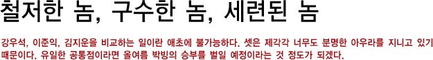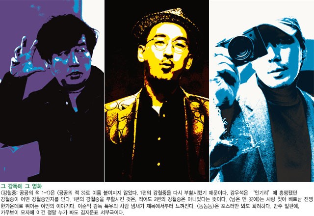 강우석, 이준익, 김지운을 비교하는 일이란 애초에 불가능하다. 셋은 제각각 너무도 분명한 아우라를 지니고 있기 때문이다. 유일한 공통점이라면 올여름 박빙의 승부를 벌일 예정이라는 것 정도가 되겠다.<br><br>[2008년 7월호]