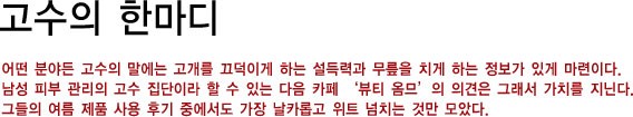 어떤 분야든 고수의 말에는 고개를 끄덕이게 하는 설득력과 무릎을 치게 하는 정보가 있게 마련이다. 남성 피부 관리의 고수 집단이라 할 수 있는 다음 카페 `뷰티 옴므`의 의견은 그래서 가치를 지닌다. 그들의 여름 제품 사용 후기 중에서도 가장 날카롭고 위트 넘치는 것만 모았다.<br><br>[2008년 7월호]
