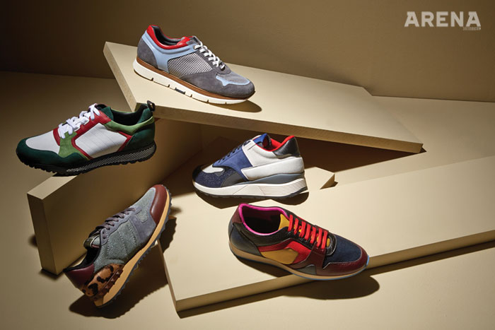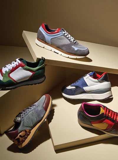 (위부터 시계 방향으로) 디자인이 뭉툭하면서 유연한 회색 스니커즈 가격미정 살바토레 페라가모, 밑창이 높고 소재가 조화로운 감색 스니커즈 가격미정 Z 제냐, 화려하지만 고상한 멀티 컬러 스니커즈 가격미정 버버리 프로섬, 뒤쪽에 무시무시한 반전이 숨어 있는 회색 스니커즈 80만원 발렌티노, 세부 사항들이 육상화만큼이나 짱짱한 녹색 스니커즈 가격미정 구찌 제품.