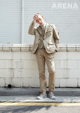 가는 줄무늬 셔츠 11만8천원·모래색 면 소재 재킷 18만8천원·베스트 12만8천원·팬츠 10만8천원 모두 비슬로우, 모래색 스니커즈 9만9천원 컨버스 제품.
