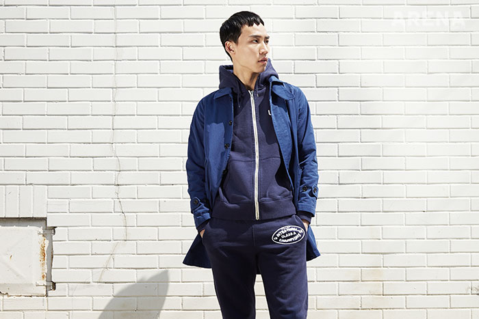 도톰한 면 소재의 싱글 코트 15만8천원·짙은 남색의 집업 후드 6만9천원·럭비공 모양을 형상화한 로고를 더한 럭비 스웨트 팬츠 5만9천원 모두 비바 스튜디오 제품.