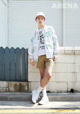 흰색 버킷 해트 4만9천원·흰색 티셔츠 4만3천원·흰 벽에 스프레이로 그래피티를 해놓은 듯한 무늬의 코치 재킷 14만6천원·베이지색 반바지 8만2천원 모두 디스이즈네버댓, 흰색 슈즈 15만원대 나이키 스포츠웨어 제품.