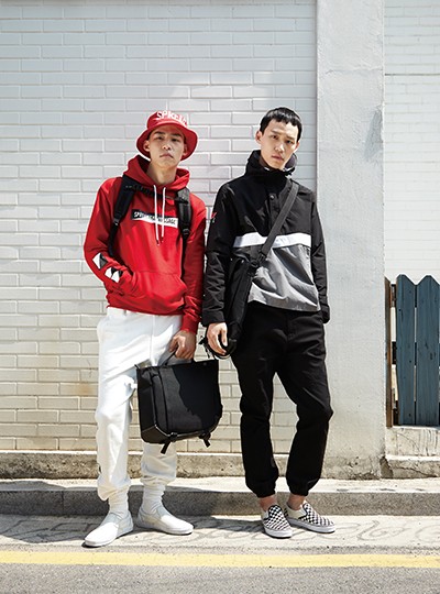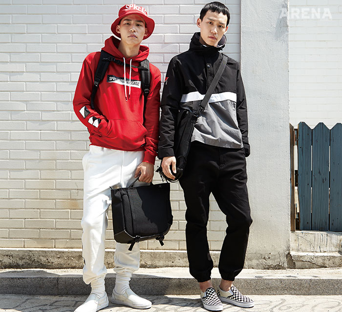 (왼쪽부터) 빨간색 버킷 해트 3만9천원·빨간색 후드 티셔츠 6만9천원·흰색 스웨트 팬츠 7만9천원 모두 브라운브레스, 15인치 노트북 공간을 포함한 다양한 수납공간을 겸비한 검은색 백팩 17만9천원·15인치 노트북 공간을 포함한 간결한 디자인의 메신저백 9만9천원 모두 비엘씨브랜드, 흰색 슬립온