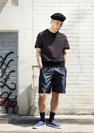 과거 프랑스의 베레를 재현한 베레 6만1천원·1970년대의 스웨트 셔츠를 모티브로, 도톰한 소재를 재현한 반소매 스웨트 셔츠 12만8천원·1970년대 복싱 쇼츠를 재현한 팬츠 13만7천원 모두 헤리티지 플로스, 슬립온 4만5천원 반스, 양말 에디터 소장품.