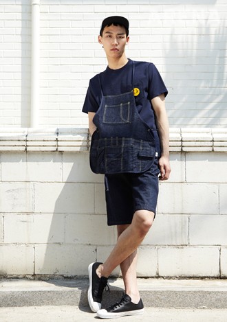 챙은 짧고 크라운은 살짝 높게 조절한 회색 캡 7만4천원·다양한 크기의 주머니로 구성된 데님 소재 에이프런 8만3천원·스마일 패치를 붙인 남색 티셔츠 6만4천원·도톰한 셀비지 데님 반바지 14만3천원 모두 withMNW, 슈즈 7만5천원 컨버스 제품.
