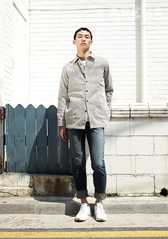 캔버스 소재의 세로 줄무늬 재킷 11만9천원·안에 입은 티셔츠 8만6천원·빈티지 워싱 데님 팬츠 16만6천원 모두 에스피오나지, 흰색 슈즈 15만원대 나이키 스포츠웨어 제품.