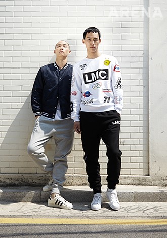 LMC의 다양한 로고를 이용한 스웨트 셔츠 6만8천원·검은색 조거 팬츠 6만9천원 모두 LMC, 슈즈 10만9천원 아디다스 오리지널스 제품.