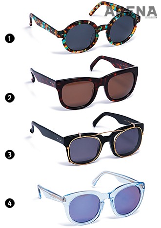 (왼쪽부터) 투명한 하늘색 프레임 선글라스 32만5천원 뮤지크, 샛노란색 렌즈의 뿔테 선글라스 가격미정 탐레블, 푸른색 렌즈의 금속 템플 선글라스 가격미정 디타 by 나스월드, 짙은 녹색 테 선글라스 30만원대 페르솔 by 룩소티카 코리아 제품.