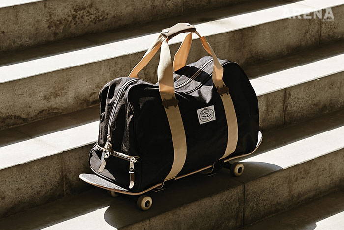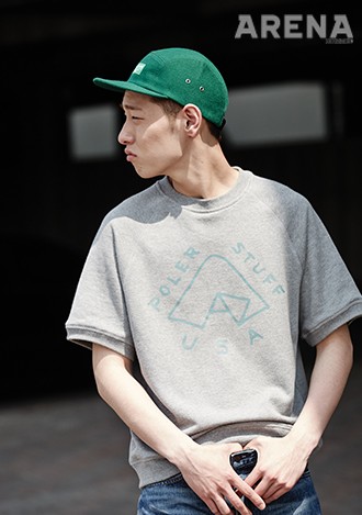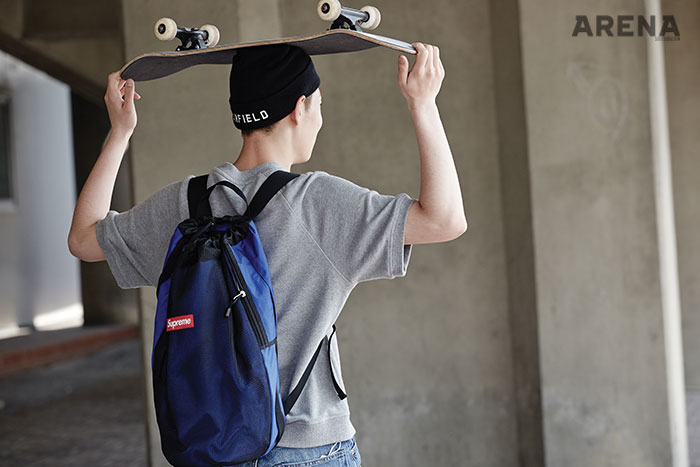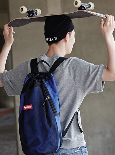 회색 반소매 스웨트 셔츠 가격미정 폴러스터프, 검은색 니트 비니 1만8천원 펜필드, 메시 소재라 가벼우면서도 실용적인 감색 백팩 30만9천원 슈프림 by ETC 서울, 스케이트보드 7만5천원 팀버샵 제품.