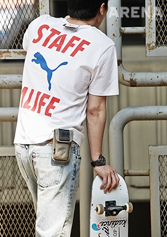 흰색 반소매 티셔츠 가격미정 푸마, 데님 팬츠 가격미정 리바이스, 허리춤에 찬 휴대폰 케이스 4만3천원 인케이스, 러버 밴드 시계 68만원 카시오, 스케이트보드 7만5천원 팀버샵 제품.