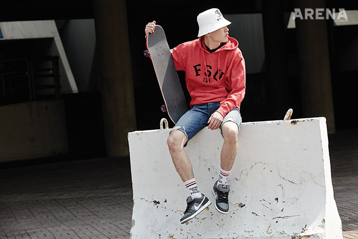 붉은색 후드 티셔츠 9만원 포스타 by 팀버샵, 감색 티셔츠 가격미정 허프, 워싱이 들어간 데님 쇼츠 가격미정 리바이스, 폴리에스테르 소재 흰색 버킷 해트 4만9천원 베리레어 by ETC 서울, 줄무늬 양말 가격미정 브라운브레스, 진회색 스니커즈 가격미정 나이키 SB 제품.