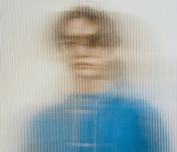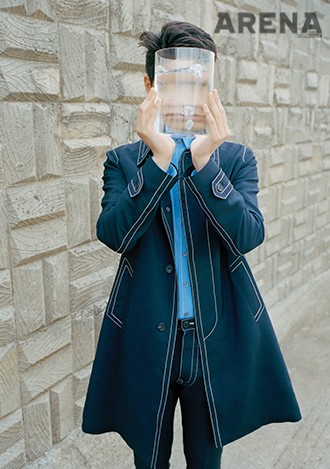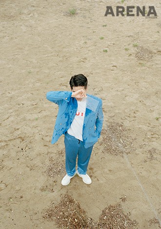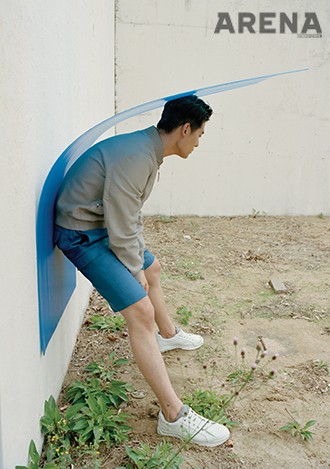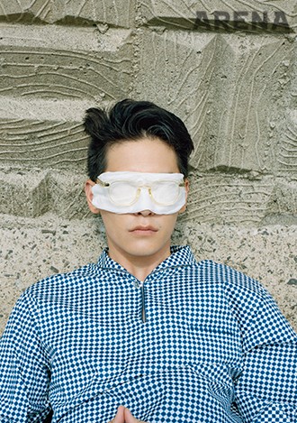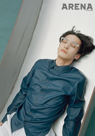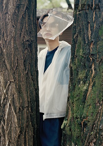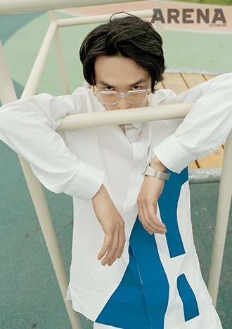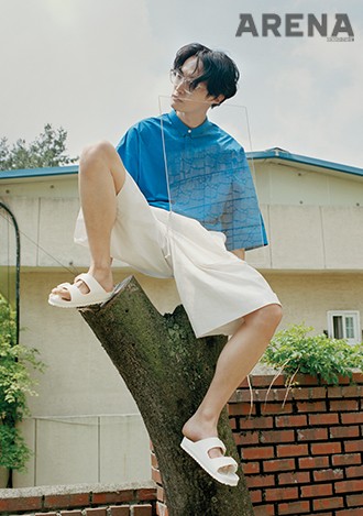 실루엣이 풍성한 파란색 7부 소매 셔츠·흰색 스트링 쇼츠 모두 가격미정 준 지, 사각 프레임 투명 뿔테 안경 28만8천원 뮤지크, 방수 소재 흰색 슬리퍼 3만8천원 버켄스탁 by 어바웃 제품.