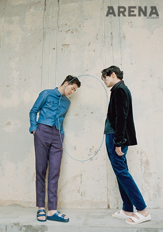 (왼쪽부터) 회색을 띤 파란색 가죽 재킷·진한 보라색 리넨 팬츠 모두 가격미정 버버리 프로섬, 방수 소재 파란색 슬리퍼 3만8천원 버켄스탁 by 어바웃 제품. 감색 벨벳 재킷·데님 재킷·벨벳 소재 팬츠 모두 가격미정 버버리 프로섬, 방수 소재 흰색 슬리퍼 3만8천원 버켄스탁 by 어바웃 제품.