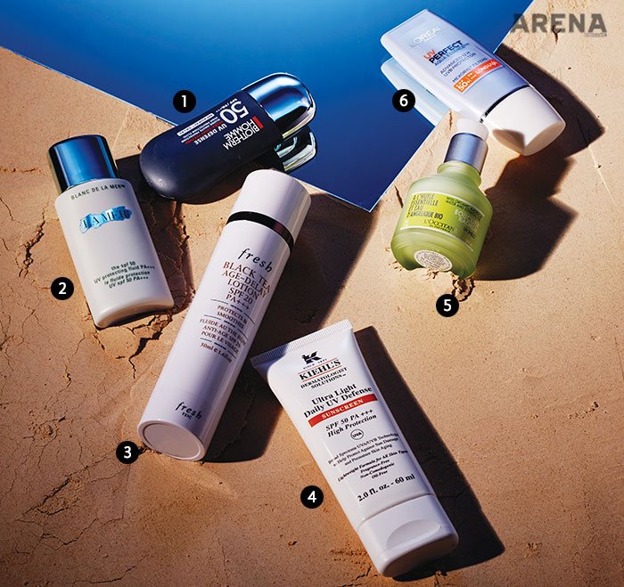 1. 황산화 효과를 주는 비타민 E와 글리세린 성분을 함유했다. 로션처럼 부드럽게 스며들며 완벽하게 자외선을 차단한다. UV 디펜스 자외선 차단제 SPF 50 PA+++ 30ml 4만9천원대 비오템 옴므 제품.