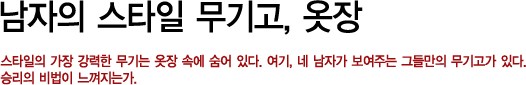 스타일의 가장 강력한 무기는 옷장 속에 숨어 있다. 여기, 네 남자가 보여주는 그들만의 무기고가 있다. 승리의 비법이 느껴지는가.<br><br>[2006년 9월호]