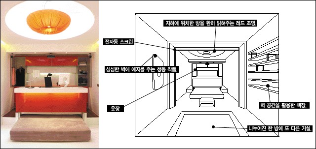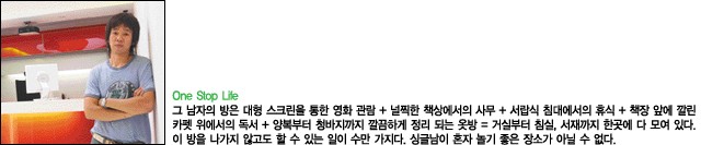 자신만의 색깔을 일찌감치 발견한 인테리어 디자이너 최용운의 옷장은 기발하기 그지없다. 그의 옷장은 어릴 적 꿈꾸던 우주선을 떠올리게 한다. 옷장을 배경으로 당당히 세워진 책상과 그 아래 서랍식으로 만들어진 침대까지. 소년이 꿈꾸던 엔터프라이즈호가 이런 모습이 아닐까. 게다가 책상 위에 달린 프로젝트가 침대 앞으로 내려질 전자동 스크린에 쏘아진다면 여긴 진정한 사령탑이 되는 것이다. 젊은 인테리어 디자이너의 옷장은 멀티플레이다. 현재 디자인 두기 인테리어 사무실 실장이라는 직함을 단 젊은 남자는 이미 일본 JCD(Japanese Society Commercial Space Design)에서 금상을 수상한 바 있는 공인받은 인재다. 동글게 만 티셔츠 꾸러미와 청바지로 채워진 오른편의 장과 넥타이를 길게 걸어놓은 왼쪽 옷장은 그날의 스타일에 따라 어느 쪽이 열릴지 결정된다. 옷을 고르는 일이 책상 들락거리는 일만큼이나 잦을 법한 스타일리시한 디자이너에게 두 공간은 분리될 수 없다. 감각적인 조명과 빛나는 레드 옷장 또한 젊은 아티스트답게 산뜻하다.