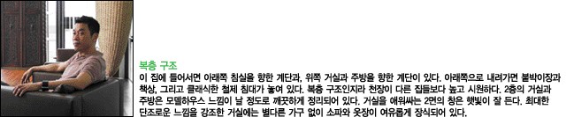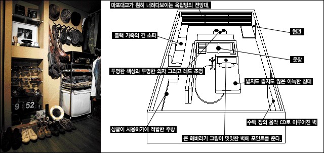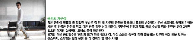 결혼하지 않은 남자의 최대 장점은 구속 받지 않는 공간 활용에 있다. 공간 디자이너이자 아트디렉터인 김치호의 집 또한 그의 독창적인 구획 정리로 범상찮은 구조를 보여준다. 카고 팬츠에 스터드 장식의 화이트 셔츠를 입은 그가 맞아준 마포의 옥탑방은 자유분방하다. 평소 옷차림을 보면 그도 만만치 않은 양의 옷을 모아놓았을 거라고 예상했다. 그리고 문을 열자 잘 정리된 집 안을 보니 또 한 번 기대에 부풀었다. 그가 우리를 인도한 곳은 침대 뒷공간을 막아서 만든 작은 옷방. 가지런히 정리한 안경과 얌전히 줄지어 걸린 모자들, 온통 아프리카 냄새가 나는 색감까지, 왠지 한 시즌을 정리해 놓은 쇼룸같이 통일된 분위기다. 반 평 남짓한 좁은 옷방이었지만 선반과 행어를 적절히 이용해 기능적인 옷장을 만들었다. ‘성격에 맞는 공간, 사용하는 사람의 라이프스타일에 맞게 사용자와 커뮤니케이션하는 공간’을 만든다는 그. 분명 먼지 한 톨도 인정하지 않는 깔끔한 성격의 소유자일 것이다.