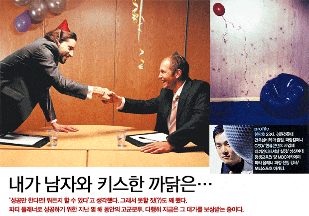 음악 소리가 작아졌는데도 사람들 목소리가 들리지 않는다. 잠깐 화장실 다녀온 사이 한 테이블이 치워졌다. 클라이언트는 내 얼굴만 빤히 바라본다. 음악과 술이 있는데 왜 놀지 못할까. 나 같으면 스테이지는 예전에 장악했다. 뭐, 좋다. 어쨌든 이 가라앉은 기분 나쁜 공기는 다 내 책임이다. 특단의 조치가 필요하다. 파티 시작 전부터 이상한 눈빛으로 날 쳐다보던 그놈에게 다가갔다. 잠깐 멈칫하긴 했다. 하지만 결국 그에게 키스했다. 아니, 한 것 같았다. 다시는 떠올리고 싶지 않은 순간인 데다 여러 번 그러지 않았을 거라고 부정을 했기에 지금은 긴가민가하다. 하지만 꾸욱 감은 눈 옆에, 뻥 뚫려 있는 두 귀로 사람들 함성 소리가 들린 것은 확실히 기억한다. “워어~~” 이쯤이면 됐다. 나의 ‘순교’로 파티는 열광의 도가니가 될 테니까. 끝까지 웃으며 백 스테이지로 향했다. 그리고 가그린 한 통을 다 마셔버렸다. 제길. 스포츠 신문에 이니셜로 등장해야 하는 위험 부담이 있는데도 ‘웃겨봐!’라고 말하는 술 취한 아저씨와 대판 싸우는 개그맨을 난 100% 이해한다. 기껏 준비한 파티에서 사람들이 잘 놀아주지 않을 때, ‘뭐 화끈하고 재미있는 이벤트 없어?’라고 묻는 클라이언트를 보면 나도 비슷한 생각이 드니까. 물론, 고용주인 클라이언트와 싸울 순 없다. 그저 이런 부담스러운 질문에 가끔 힘이 빠진다는 소리다. 또 이런 파티가 끝나면 늘 기획 과정을 반성하고 다음 파티 기획 때 같은 실수를 반복하지 않기 위해서…, blah blah blah…. 쏘리, 조금 구차했다. 처음 파티를 기획했을 때만 해도 제약이 많았다. 제대하고 대학 졸업한 남자가 시작하기엔 불안한 분야였다. 가족과 친구의 우려는 나를 많이 위축시켰다. 그때마다 내 기획 아이디어는 점점 과감해졌다. 위축된 나를 좀 더 고무시키기 위한 의도였다. 백화점이 폐장하면 속옷만 입고(물론 나체로 들어가면 더 좋다. 속옷 매장은 충분히 있으니까) 참가자들이 들어가 원하는 옷으로 마음껏 갈아입고 파티를 즐기자는 등 기발한 기획이 우르르 나왔다. 물론 대부분이 실제로 이뤄지진 않았다. 진보는 늘 벽에 부딪치게 마련이니까, 룰루랄라~. 파티에서 가장 중요한 것은 느끼는 재미다. 보이는 재미는 두 번째다. 흔히 사람들은, 심지어 파티 플래너조차 보이는 것이 전부라고 생각하는 경우가 많다. 하지만 확실한 테마가 있는 파티를 기획한다면 많은 돈을 투자한 파티에서 보다 더 재미있게 즐길 수 있다. 예를 들어 ‘보석 파티’에 사람들을 초대한다고 가정하자. 비싼 보석을 전시하고 감상하는 파티라고 생각하겠지만 이 파티는 007게임이 접목된 파티다. 무대 한복판에 보석을 설치하고 이를 훔치라고 지령을 내린다. 몇몇 경호원이 지키고 있고 30분마다 불이 꺼진다. 난 파티와 럭셔리라는 단어를 동일시하는 대부분의 클라이언트 인식을 바꾸고자 ‘돈 안 쓰는 파티’기획에 매달렸고 시장도 슬슬 이를 받아들였다. ‘파티 플래너’가 되고 싶은 사람들 앞에서 늘 강조하는 말이 파티는 단순히 즐기는 놀이가 아닌 사람과의 관계를 완화해주는 매개체라는 것이다. 파티는 참가자 모두 즐거움을 공유하는 게 가장 중요하며, 이를 위해 플래너는 참가자 한 명 한 명에게 즐길 수 있는 기회를 평등하게 주어야 한다. 파티에선 누구나 주인공이 되고 싶지만, 어디에나 변방에 떨어진 사람은 있게 마련이므로. 세상 누구보다 파티에 자주 참가하면서 플래너 스스로는 절대 파티를 즐길 수 없는 이유다. 플래너는 항상 변방에 있으면서 변방에 함께 떨어져 있는 이들을 즐겁게 해주고, 다른 사람과 어울릴 수 있도록 갖은 노력을 기울여야 한다. 클라이언트와 계약을 성사시킬 때도 마찬가지다. 그와 계약을 하기 전에, 내가 무엇을 줄 수 있다는 확신에 찬 제안서가 반드시 필요하다. 인간 관계는 냉정하게 이야기하면 ‘give&take’다. 순서는 ‘give’ 다음이 ‘take’다. 다행히, 파티 플래너라는 직업에 큰 관심이 쏟아지고 있다. 성급히 결론부터 말하면 이 시장엔 거품이 많다. 대학 졸업자 평균 연봉에 한참 미치지 못하는 액수를 벌 각오도 단단히 해야 한다. 게다가 이 파티 시장은 대부분 인맥으로 움직인다. 클라이언트 회사에 아는 사람이 있으면 계약을 맺는 식이다. 결국 이런 사람들이 시장을 잠식하면서 아이디어가 설자리가 없어졌다. 이런 파티는 진정한 파티가 아니다. 하지만 모든 걸 뚫고 진정한 파티 플래너가 되고 싶은 당신이라면 환영의 커다란 플래카드를 걸어주겠다. 당신에게 필요한 것은 유연한 인간 관계와 기발한 아이디어, 그리고 추진력뿐이다. 어쨌든 난, 3여 년간 성공적으로 파티 기획을 했고 이젠 그만뒀다. 지금은 당당한 멀티잡족으로 바쁜 하루하루를 보내고 있다. 대학에서 파티 플래너 과정을 강의하고 있고, 한류 문화 콘텐츠를 기획하고 있으며, 카지노 컨설턴트, 모터스포츠 마케터라는 명함도 있다. 물론, 파티 기획을 했을 때와는 비교도 안 될 정도로 수입도 짭짤하다. 이 일들은 모두 기발한 기획을 하고, 그 기획을 성사시키기 위해 노력하며, 늘 새로운 것을 받아들이게 만든 파티 기획에서 파생된 일이다. 사실
