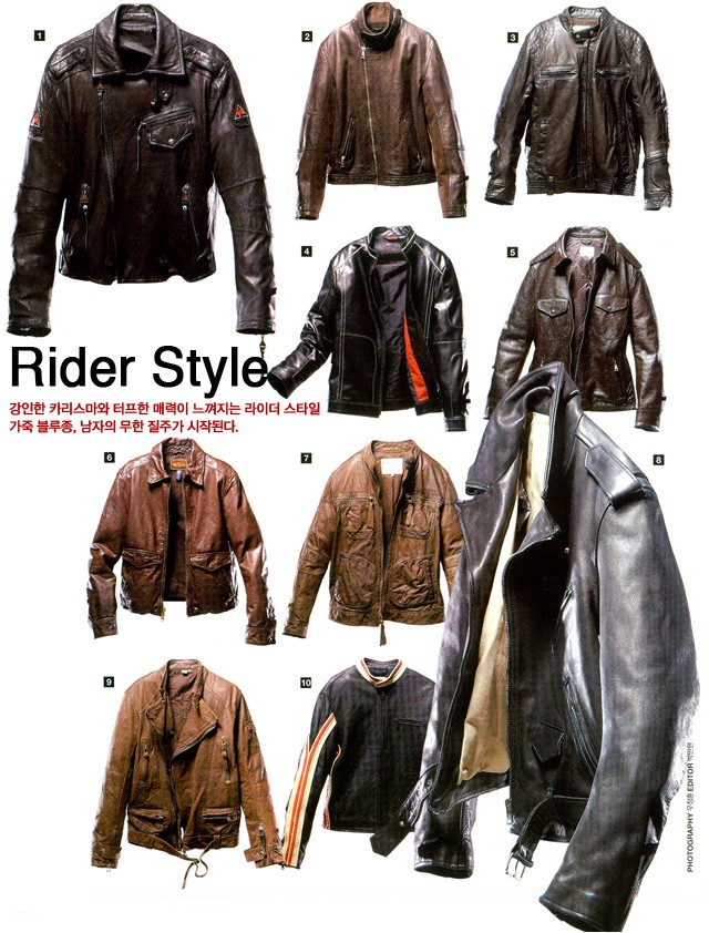 1 사이버적인 느낌의 블랙 컬러 라이더 스타일 블루종. 58만원 르꼬끄 스포르티브 제품. 2 베이식하다. 그래서 꼭 이런 디자인 하나는 옷장에 있어야만 한다. 다크 브라운 컬러의 소가죽 블루종. 97만원 케네스 콜 제품. 3 눈썰미 좋은 남자라면 어깨 라인 스티치에 주목하라. 개성 있는 블랙 컬러 양가죽 블루종. 40만원대 니퍼 제품. 4 메탈릭 톤의 블랙 컬러 라이더 스타일 가죽 블루종. 화이트 스티치가 당신의 감각을 업그레이드 해준다는 것을 명심하자. 가격미정 지오 지아 제품. 5 다크 브라운 컬러의 가죽 블루종. 평범한 듯싶지만 입으면 카리스마 가이로 변신한다. 88만원 가스 진 제품. 6 브라운 컬러 심플한 디자인의 소가죽 블루종. 카고 팬츠와 매치하라고 강력히 권한다. 1백50만원대 얼진 at 더 랩 제품. 7 제임스 딘이 부럽지 않다! 라이트 브라운 컬러의 산양가죽 블루종 59만9천원 버커루 제품. 8 전형적인 라이더 스타일 소가죽 블루종. 할리데이비슨을 사기 위해 지갑을 열어야만 할까? 1백55만9천원 스톤 아일랜드 제품. 9 그런지한 느낌의 브라운 컬러 라이더 스타일 소가죽 블루종. 48만8천원 도크 제품. 10 당신의 패션 스타일에 빈티지 터치를! 블랙 소가죽 블루종 가격미정 A|X 제품. |