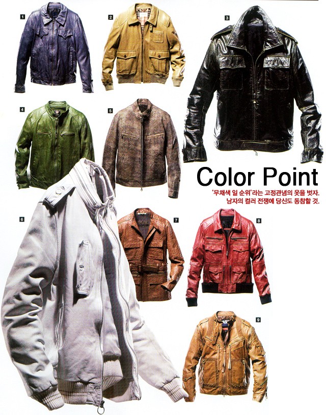 1 빈티지 스타일의 네이비 컬러 집업 양가죽 블루종. 43만원 코데즈 컴바인 제품. 2 올리브 그린 컬러의 고무 밴드가 가미된 양가죽 블루종. 2백65만원 버버리 제품. 3 영화 <매트릭스4>가 제작된다면 이런 블루종 하나 등장할 만하다. 광택 소재의 가죽 블루종. 가격미정 어나더 에디션 제품. 4 3백65일 다양한 데님 팬츠의 바리에이션을 즐기는 당신, 라이트 그린 컬러의 양가죽 블루종을 입어라. 59만원 안트 웰트 제품. 5 탄탄한 외형에 매끈한 광택까지, 갑옷이 연상되는 그레이 컬러 디테일의 물뱀 가죽 블루종. 가격미정 살바토레 페라가모 제품. 6 당신, 해군을 꿈꾸었는가? 밀리터리 스타일을 입고 싶다면 이번엔 해군처럼 입어보자. 화이트 컬러 양가죽 블루종. 39만8천원 엘록 제품. 7 럭셔리함의 진수를 보여주는 브라운 컬러의 타조 가죽 사파리풍 블루종. 가격미정 루이 비통 제품. 8 휴대폰에 담배 케이스까지 당신의 소지품은 이 젊은 디자이너의 아이디어로 한방에 해결된다. 포켓이 많은 와인 컬러 소가죽 블루종. 60만원대 제너럴 아이디어 by 범석 제품. 9 파일럿 스타일의 브라운 컬러 양가죽 블루종. 40만원대 애스크 제품. |