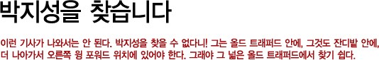 이런 기사가 나와서는 안 된다. 박지성을 찾을 수 없다니! 그는 올드 트래퍼드 안에, 그것도 잔디밭 안에, 더 나아가서 오른쪽 윙 포워드 위치에 있어야 한다. 그래야 그 넓은 올드 트래퍼드에서 찾기 쉽다.<br><br>[2006년 9월호]