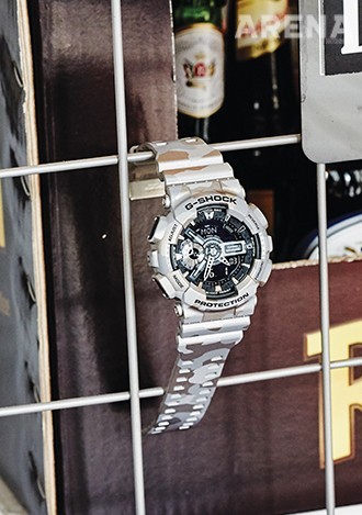 지샥 카무플라주 시리즈 제품이다. 듬성듬성 카무플라주를 입은 이 시계의 박력 있는 크기가 범상치 않다. 모양새만큼 강한 내구성과 스톱워치 기능, 월드 타임 표시, 20기압 방수 등 다양한 기능으로 무장했다. 가격 18만원.