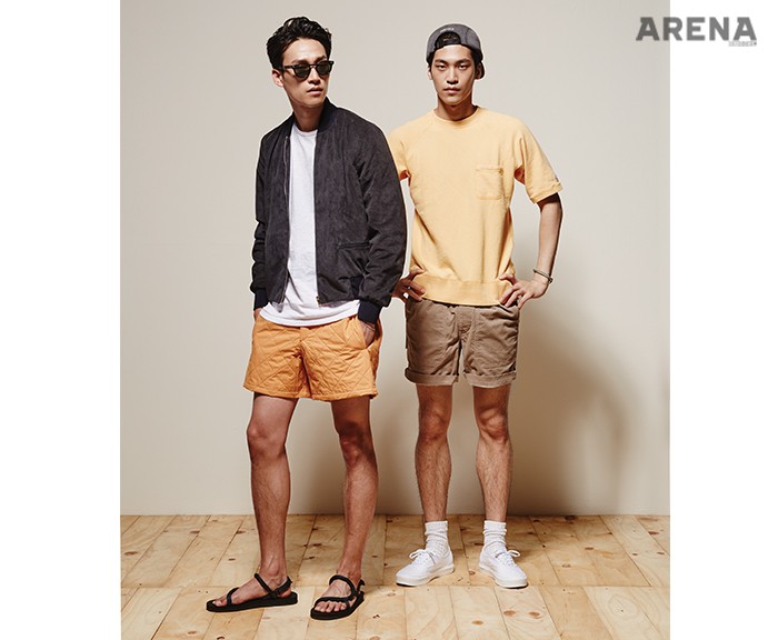 (왼쪽부터) 감색 스웨이드 블루종 가격미정 폴 스미스, 흰색 티셔츠 가격미정 알레그리, 주황색 쇼츠 28만9천원 유밋 베넌 by 존 화이트,