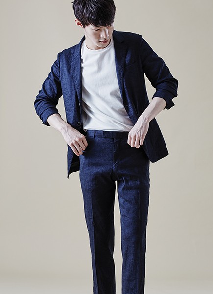 리넨 혼방의 감색 재킷 73만원·감색 바지 33만5천원·흰색 티셔츠 19만5천원 모두 타임 옴므 제품.