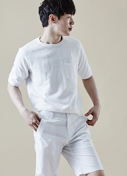 보일 듯 말 듯한 레터링이 가미된 반소매 스웨트 셔츠는 무난한 디자인으로 어느 팬츠와도 잘 어울린다. 비슷한 색상의 흰색 쇼츠와 깔끔하게 매치해보라. 신축성이 탁월한 소재의 쇼츠로 편안하게 착용할 수 있다.