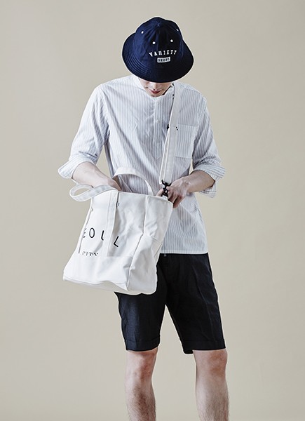 세로 줄무늬가 가미된 흰색 셔츠와 감색 쇼츠를 매치해봤다. 그리고 서울 도시명을 로고로 응용한 가방과 모자를 액세서리로 활용하면 젊은 감각의 스트리트 룩을 완성할 수 있다. 스트랩 탈착이 가능한 가방은 숄더백과 토트백 두 가지 방법으로 활용할 수 있다.