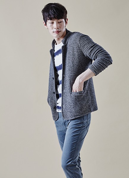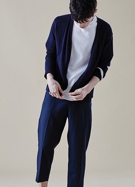 감색 집업 카디건 27만5천원· 흰색 티셔츠 17만5천원·7부 길이의 감색 슬랙스 27만5천원 모두 시스템 옴므 제품.