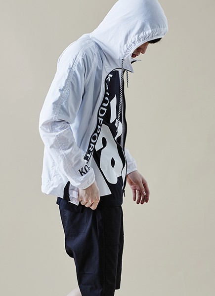 볼드한 레터링이 가미된 흰색 점퍼 15만9천원·전면의 로고가 돋보이는 검은색 티셔츠 5만9천9백원·넉넉한 실루엣의 검은색 배기 쇼츠 9만9천원 모두 카이아크만 제품.