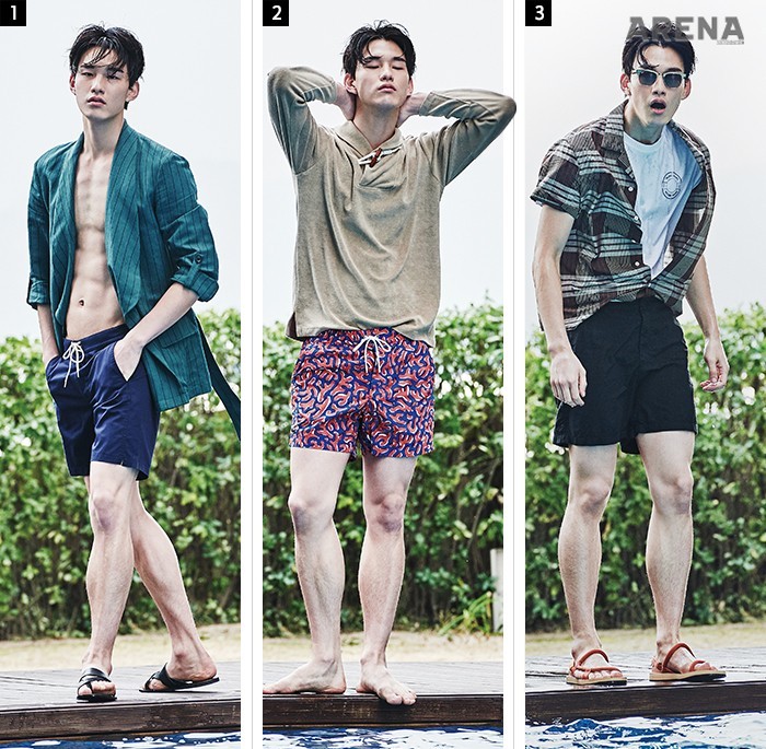 벨트가 있는 가운 형태의 숄칼라 재킷 98만9천원 유밋 베넌 by 존 화이트, 감색 서핑 쇼츠 15만8천원 엠니 by 플롯, 가죽 스트랩 슬리퍼 15만원 올세인츠 제품.