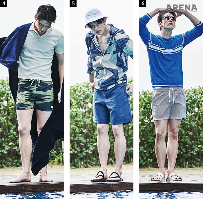 짧고 타이트한 수영복엔 잘 맞는 상의가 어울린다. 헐렁한 스웨터를 걸치면 의도치 않은 여성스러움을 풍길 가능성이 있다. 몸에 적당히 붙는 폴로 셔츠라면 훌륭한 대안이 된다. 물론 ‘건강하고 탄탄한 몸매’라는 전제 조건이 필요하다. 약간의 군살은 문제가 안 된다. 세련된 비치 타월로 가리면 되니까.