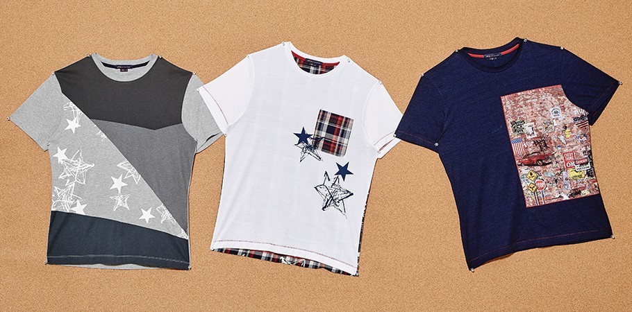 (왼쪽부터) 다양한 이미지와 패치가 콜라주를 이루고 있는 검은색 티셔츠 21만5천원·과거와 현재의 음향 기기가 각각 흑백과 컬러 프린트로 들어간 흰색 티셔츠 18만9천원·어깨와 소매 끝 흰색 실로 스티치를 가미한 기본적인 디자인의 멜란지 티셔츠 15만5천원 모두 시스템 옴므 제품.