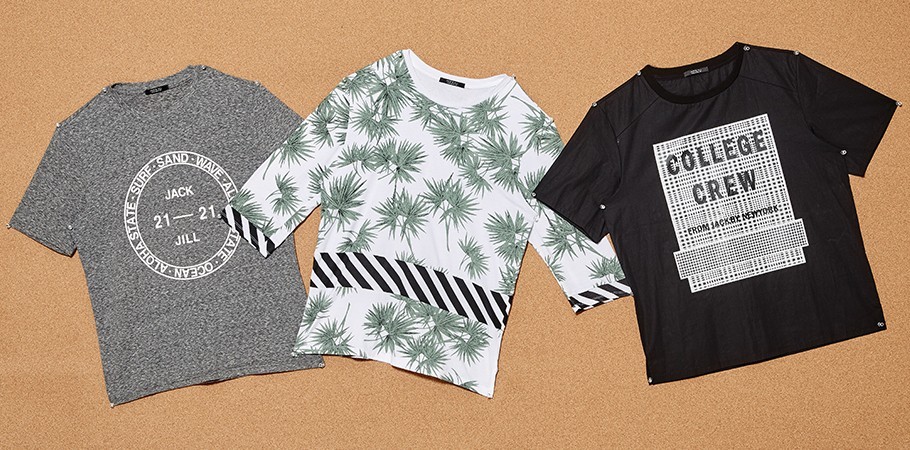 (왼쪽부터) 도드라지는 멜란지 소재에 흰 레터링 프린트가 들어간 회색 티셔츠 4만9천원·야자수 잎사귀 무늬와 사선 줄무늬가 돋보이는 칠부 소매 티셔츠 4만9천원·흰 체크무늬 위로 레터링이 가미된 검은색 티셔츠 5만9천원 모두 잭앤질 제품.