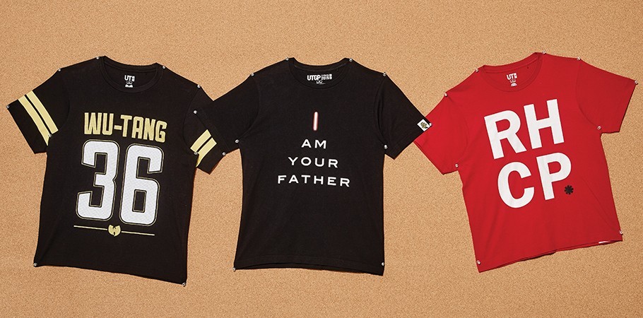 1만9천9백원·록 그룹 ‘레드 핫 칠리 페퍼스’의 이니셜을 로고로 새긴 붉은색 티셔츠 1만9천9백원 모두 유니클로 제품.
