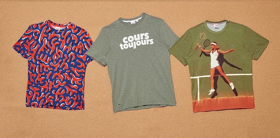 (왼쪽부터) 붉은색과 청색의 보색 대비가 강렬한 프린트 티셔츠 8만3천원·‘계속 노력하라’라는 프랑스어 레터링이 적힌 옅은 카키색 티셔츠 6만8천원·레트로풍의 과거 브랜드 캠페인 컷을 그대로 전사한 티셔츠 9만8천원 모두 라코스테 라이브 제품.