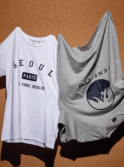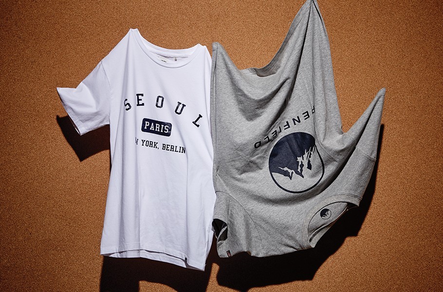 서울 도시명을 영문 레터링으로 새긴 흰색 티셔츠 7만8천원 티아이포맨·브랜드의 상징적인 산봉오리 로고가 들어간 40주년 한정판 티셔츠 2만9천8백원 펜필드 제품.