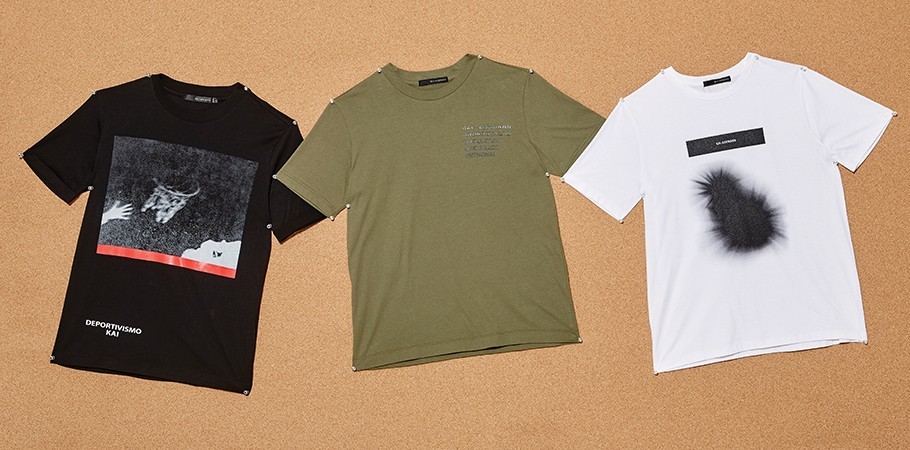 (왼쪽부터) 추상적인 흑백 사진과 레터링 프린트의 검은색 티셔츠 5만9천9백원·왼쪽 상단 가슴 부위에 광택감이 도는 레터링이 프린트된 밀리터리풍의 카키색 티셔츠 3만9천9백원·번진 듯이 보이는 검은색 그래픽이 가미된 흰색 티셔츠 3만9천9백원 모두 카이아크만 제품.