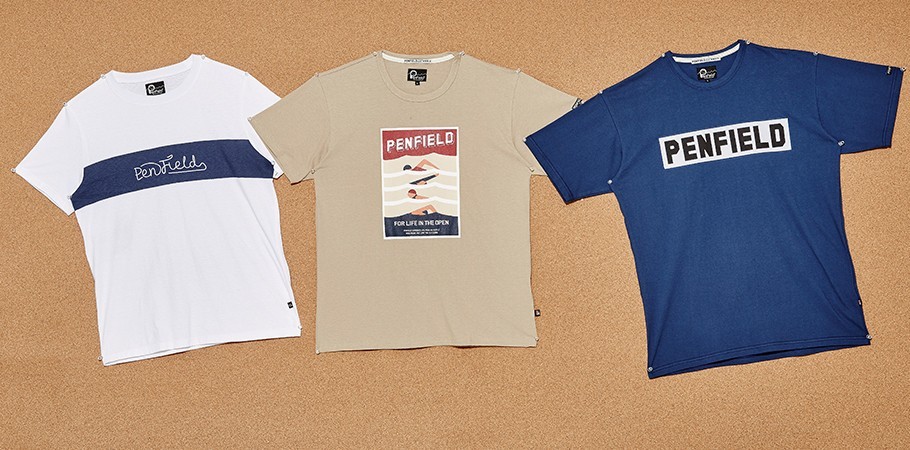 (왼쪽부터) 브랜드의 40주년을 기념하기 위한 한정판으로 브랜드명을 귀여운 필기체로 표현한 흰색 티셔츠 2만9천8백원·빈티지한 수영장 포스터가 프린트된 베이지색 티셔츠 5만8천원·브랜드 로고를 정중앙에 가미한 시원한 색감의 청색 티셔츠 5만8천원 모두 펜필드 제품.
