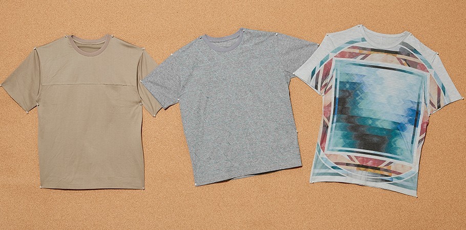 (왼쪽부터) 상부의 절개가 히든 포켓 디테일로 이어지는 옅은 갈색 티셔츠 17만5천원·반복적이고 직선적인 민트 색상의 스티치 장식이 섬세하게 가미된 멜란지 티셔츠 23만5천원·기하학적인 패턴이 전면에 프린트된 얇은 소재의 옅은 회색 티셔츠 21만5천원 모두 타임 옴므 제품.