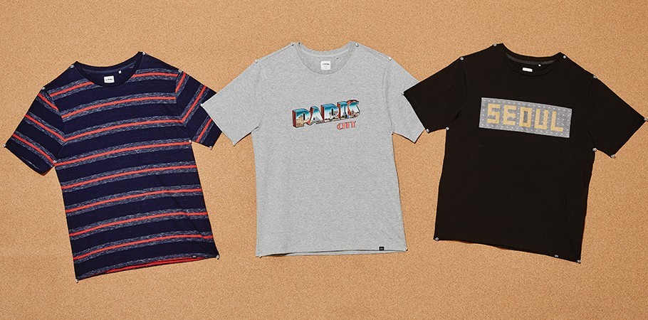 (왼쪽부터) 점잖은 감색 위로 강렬한 붉은 줄무늬가 돋보이는 티셔츠 8만8천원·에펠탑, 개선문과 같은 파리의 상징적인 건축물들이 입체적인 타이포그래피 속에 가미된 회색 티셔츠 7만8천원·서울의 보도블록을 응용해 도시명을 영자로 표현한 검은색 티셔츠 7만8천원 모두 티아이포맨 제품.