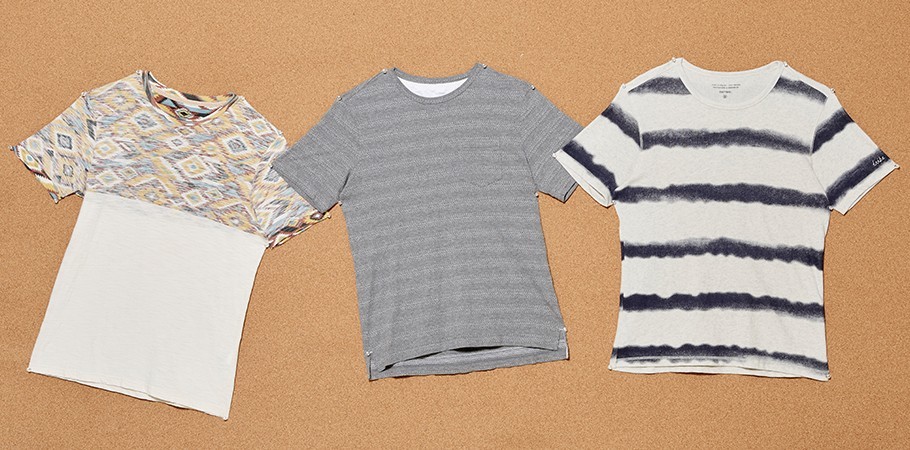 (왼쪽부터) 뒤집어 입은 듯 안쪽의 에스닉한 패턴이 겉으로 은근하게 드러나는 얇은 소재감의 티셔츠 11만9천원·줄무늬 형태로 오돌토돌한 자수 처리가 돋보이는 회색 티셔츠 7만9천원·스프레이로 그은 듯 불규칙적인 감색 줄무늬가 돋보이는 크림색 티셔츠 9만9천원 모두 시리즈 제품.